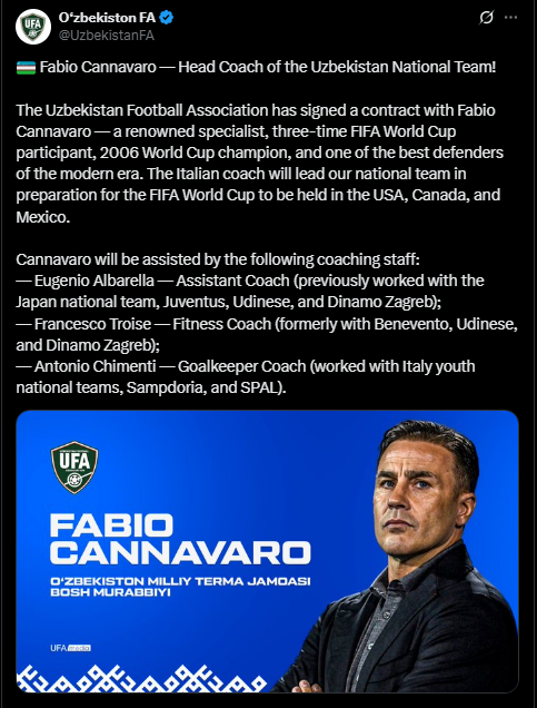 وفي وقت سابق، ذكر فابريزيو رومانو الصحفي الموثوق أنه تم الاتفاق على شروط العقد بين الاتحاد الأوزبكستاني لكرة القدم وفابيو كانافارو، ومن المتوقع مراجعة الوثائق الرسمية وتوقيعها خلال 24 ساعة، حيث كُشف يوم الاثنين عن استعداد كانافارو لقبول المهمة، من أجل أن يكون مدرب أوزبكستان في كأس العالم 2026.