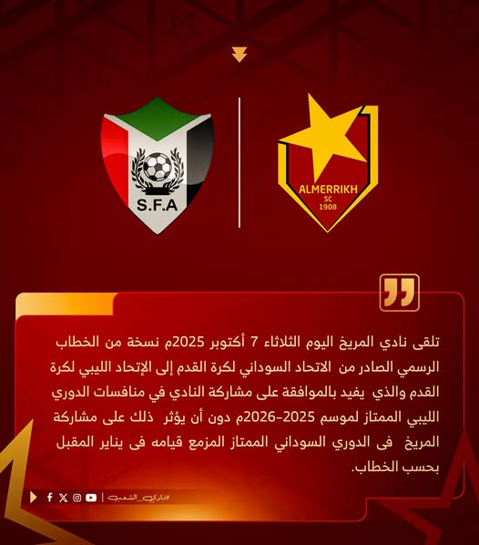 وتلقى نادي المريخ السوداني خطاب من الاتحاد السوداني لكرة القدم بالموافقة على مشاركة النادي في بطولة الدوري الليبي، موضحا أن قرار المشاركة في الدوري الليبي دون أن يؤثر ذلك على مشاركته في الدوري السوداني الممتاز المزمع قيامه في يناير المقبل.