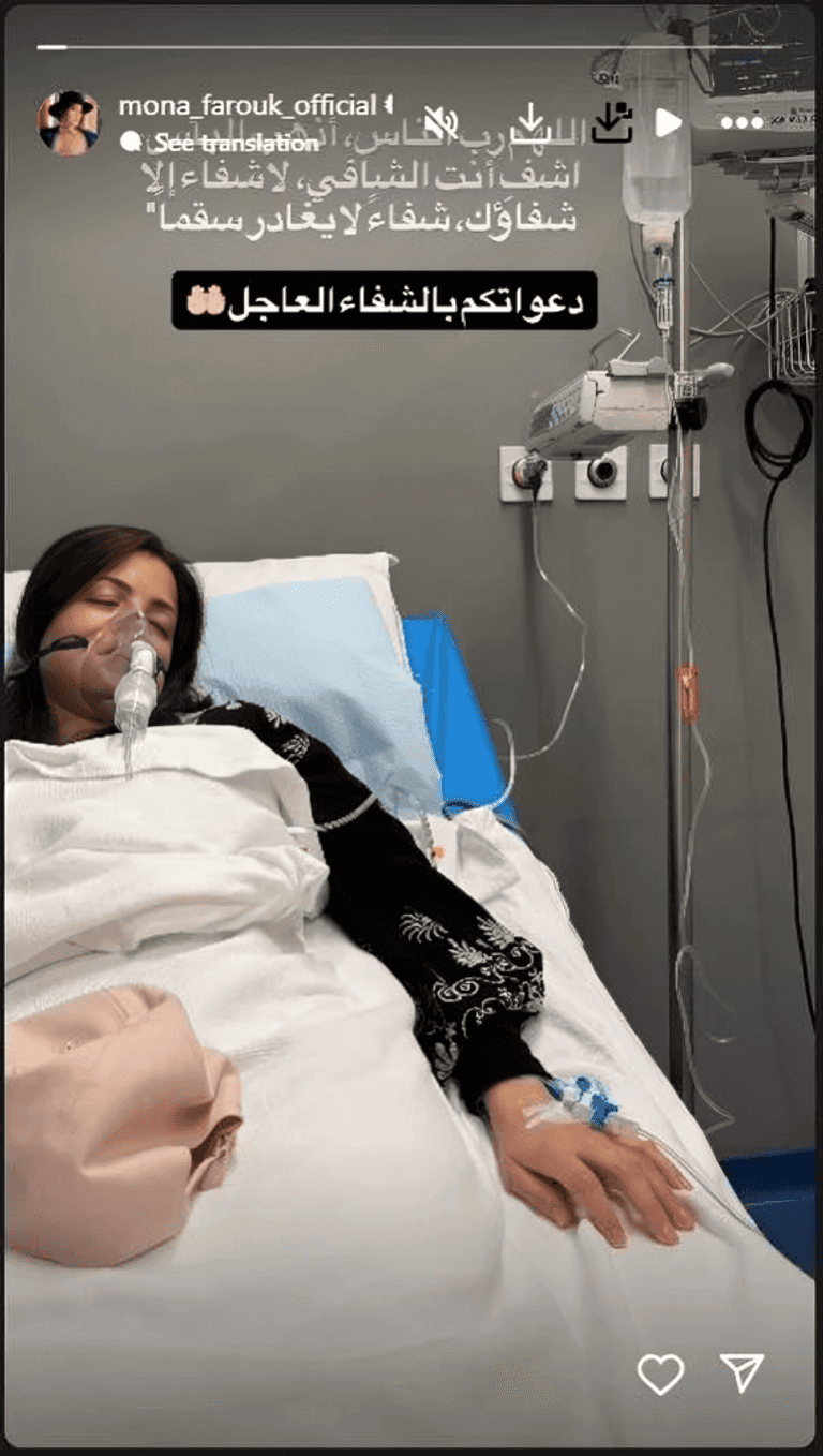 ونشرت منى فاروق صورة لها من داخل المستشفى عبر خاصية "الستوري"، معلقة عليها: «اللهم رب الناس أذهب البأس، اشفِ أنت الشافي، لا شفاء إلا شفاؤك، شفاءً لا يغادر سقمًا.. دعواتكم بالشفاء العاجل»، في رسالة مؤثرة أكدت من خلالها على حاجتها للدعم المعنوي من متابعيها خلال هذه الأزمة الصحية المفاجئة.