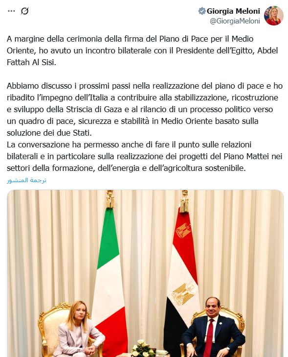 وقالت ميلوني في منشور عبر حسابها الرسمي على منصة “إكس”: “على هامش حفل توقيع خطة السلام في الشرق الأوسط، عقدت لقاءً ثنائيًا مع السيد الرئيس المصري عبد الفتاح السيسي، وناقشنا الخطوات التالية في تنفيذ خطة السلام”.