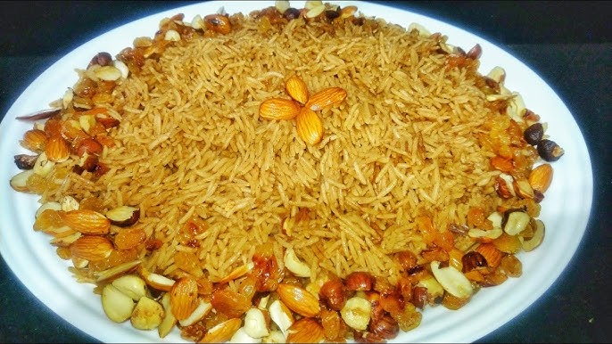 وبعد النضج، يقلب الأرز برفق باستخدام شوكة لتفكيك الحبوب، ثم يقدم في طبق التقديم مزينا بالمكسرات المحمصة والزبيب ويمكن إضافة شرائح اللحم أو الدجاج المشوي لتقديمه كوجبة متكاملة.