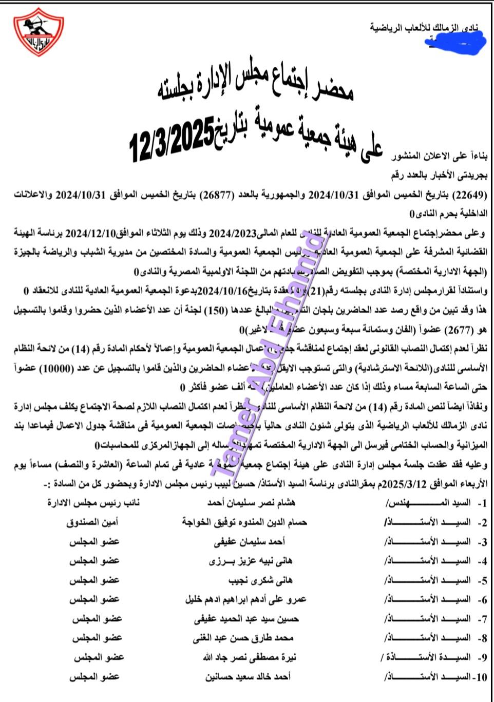 وكتب الكابتن تامر عبد الحميد معلقًا على الصور: "ده محضر اجتماع مجلس إدارة حسين لبيب بالكامل!.. الاجتماع اللي باعوا فيه أرض النادي وزيّفوا فيه إرادة الجمعية العمومية!.. بس الدولة رفضت المهزلة دي وقالت لاء بصوت عالي".