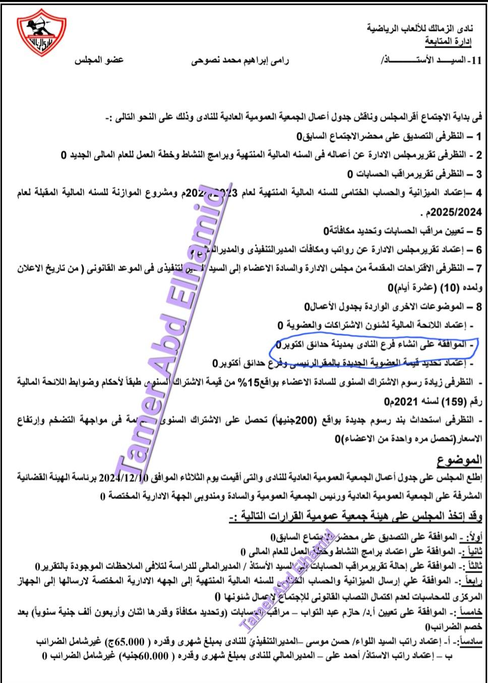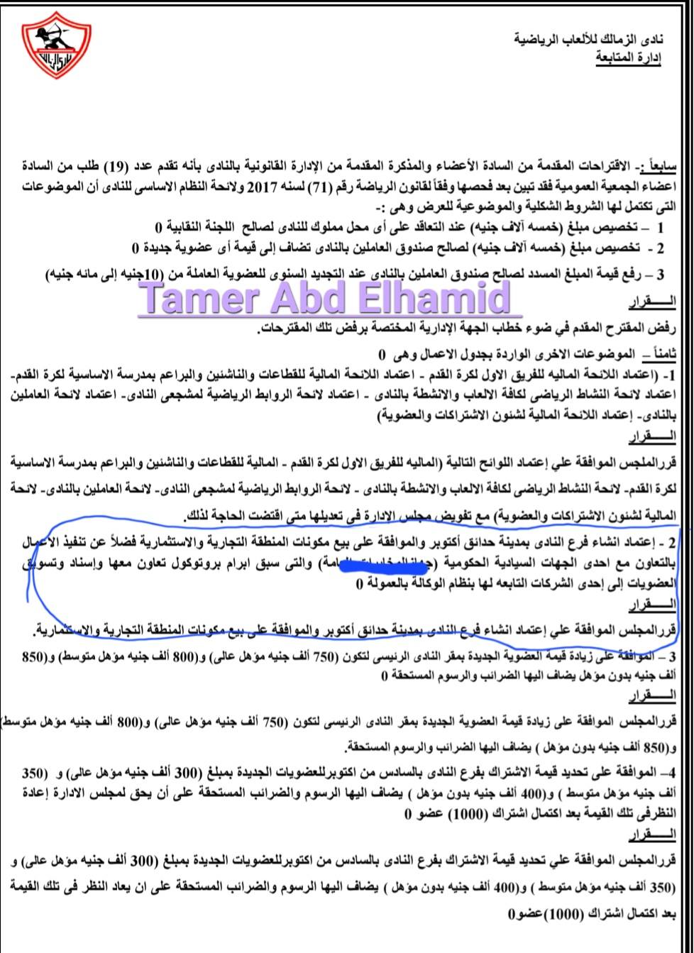 ونشر الكابتن تامر عبد الحميد نجم الزمالك السابق، صورًا زاعمًا أنها تكشف محضر اجتماع مجلس إدارة القلعة البيضاء حسين لبيب والذي تم فيه بيع أرض النادي بمدينة 6 أكتوبر.
