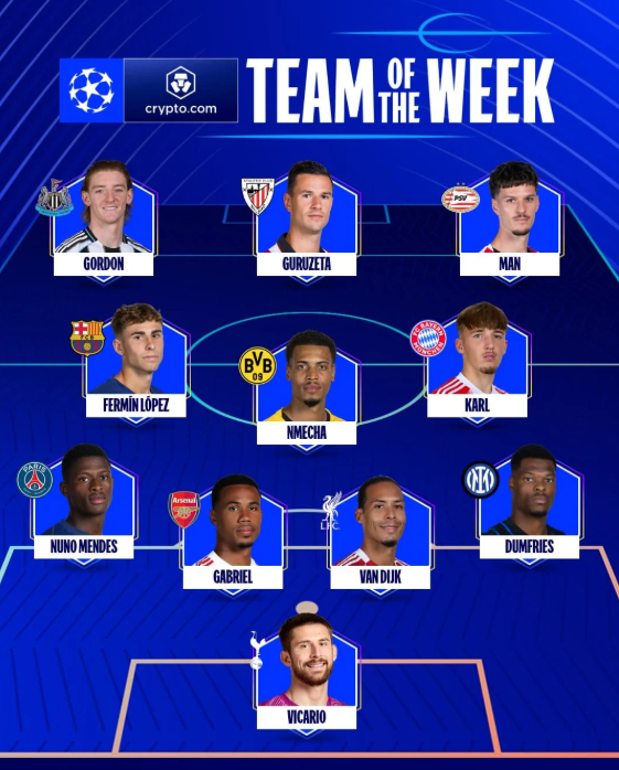 أعلن الاتحاد الأوروبي لكرة القدم "يويفا" التشكيلة المثالية للجولة الثالثة من دوري أبطال أوروبا، بعد ختام سلسلة من المواجهات المثيرة التي شهدت تألقًا لافتًا لعدد من أبرز نجوم القارة.