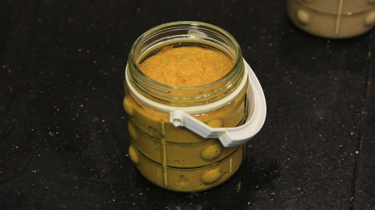 وبعد النقع، توضع البذور مع السائل في الخلاط الكهربائي، ثم يضاف الكركم والملح والسكر والزيت ويتم الخلط حتى تتكون عجينة ناعمة القوام تشبه الصلصة.