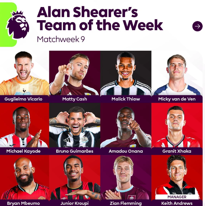 وجاء تشكيل آلان شيرر المثالية للجولة التاسعة من الدوري الإنجليزي: