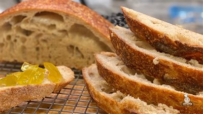 ثم يخبز الخبز في فرن ساخن مسبقا على درجة حرارة مئة وثمانين مئوية لمدة عشرين دقيقة تقريبا حتى يصبح لونه ذهبيا.