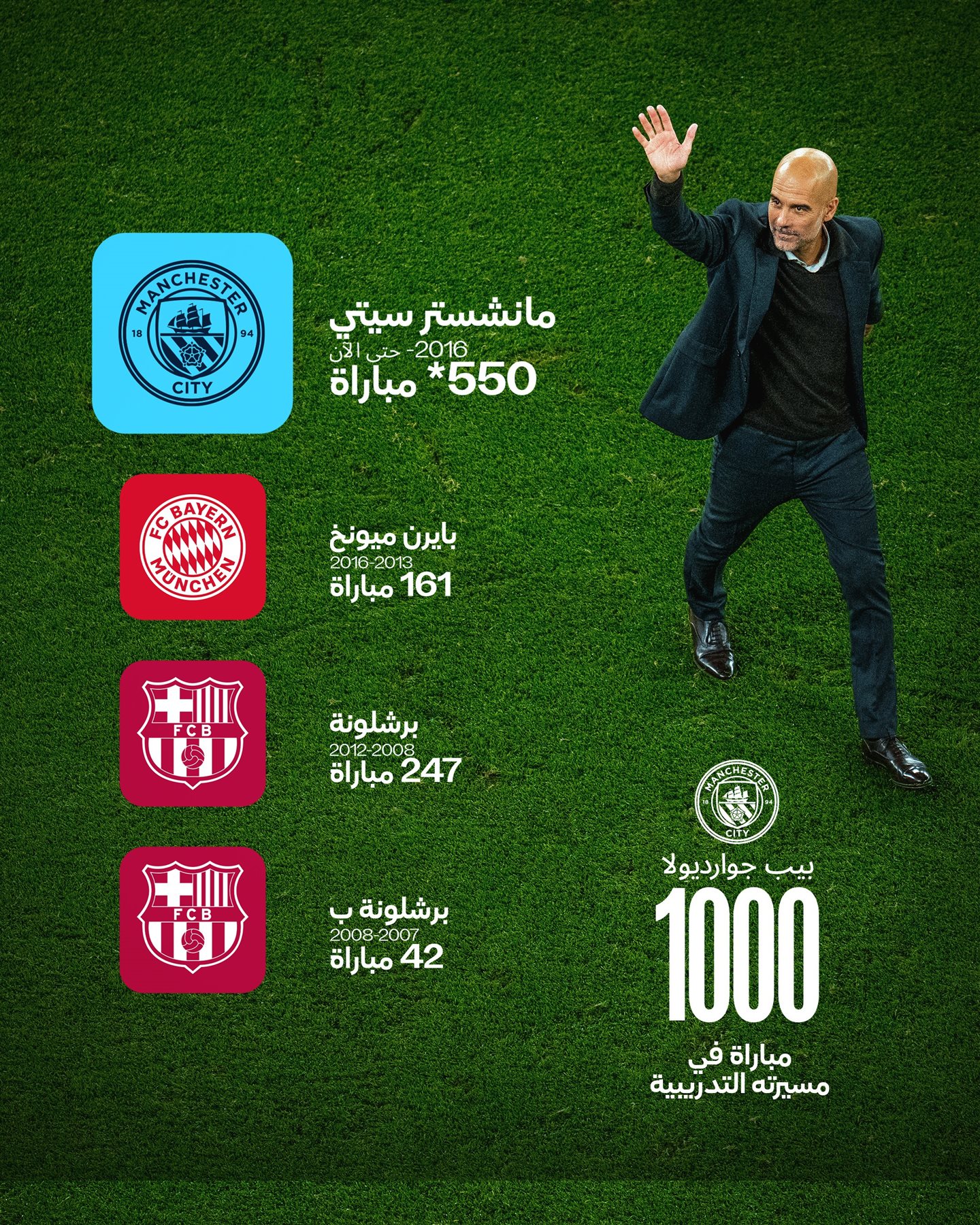 وصل الإسباني بيب جوارديولا إلى علامة تاريخية في مسيرته التدريبية، بعدما أدار 1000 مباراة على مستوى الأندية والمنتخبات، محققًا خلالها سلسلة من الإنجازات التي تثبت مكانته كأحد أعظم المدربين في تاريخ كرة القدم.