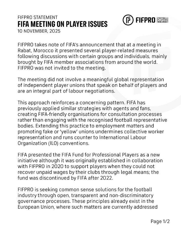 وأوضح الاتحاد الدولي للاعبين المحترفين في بيان رسمي، أن الاجتماع خلا من أي تمثيل فعلي لنقابات اللاعبين المستقلة، وهي الجهات المخولة بالتحدث باسم اللاعبين وتمثل عنصرًا أساسيًا في مفاوضات العمل داخل صناعة كرة القدم.