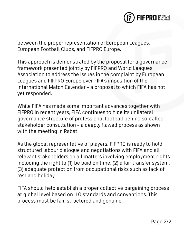 وفي الوقت الذي أحرز فيه الجانبان تقدمًا في السنوات الأخيرة، شدد فيفبرو على أن الفيفا ما يزال يعتمد هيكلًا أحاديًا في إدارة كرة القدم الاحترافية، وأن ما يسمى بـ "تشاور أصحاب المصلحة" يمثل عملية معيبة، وهو ما بدا واضحًا في اجتماع الرباط.