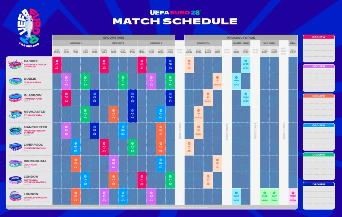 ستُقام المباراة الافتتاحية يوم الجمعة 9 يونيو 2028 على الملعب الوطني في ويلز بكارديف.