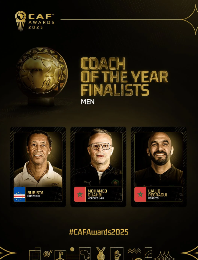 ضمت القائمة الأولية على جائزة أفضل مدرب لعام 2025: بوبيتسا، مدرب منتخب كاب فيردي، حسام حسن، مدرب منتخب مصر، كرونوسلاف يورتشيتش، مدرب بيراميدز، سامي الطرابلسي، وروموالد راكونتدراب، ومعين الشعباني، وطارق السكتيوي، ومحمد وهبي، ووليد الركراكي، مدرب وبابي تياو.