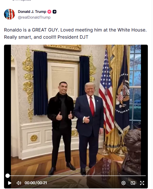 ونشر ترامب مقطع فيديو عبر حسابه الرسمي على منصة Truth Social، ظهر خلاله وهو يمارس كرة القدم النجم البرتغالي، والذي بدا واضحًا أنه مفبرك وغير حقيقي.