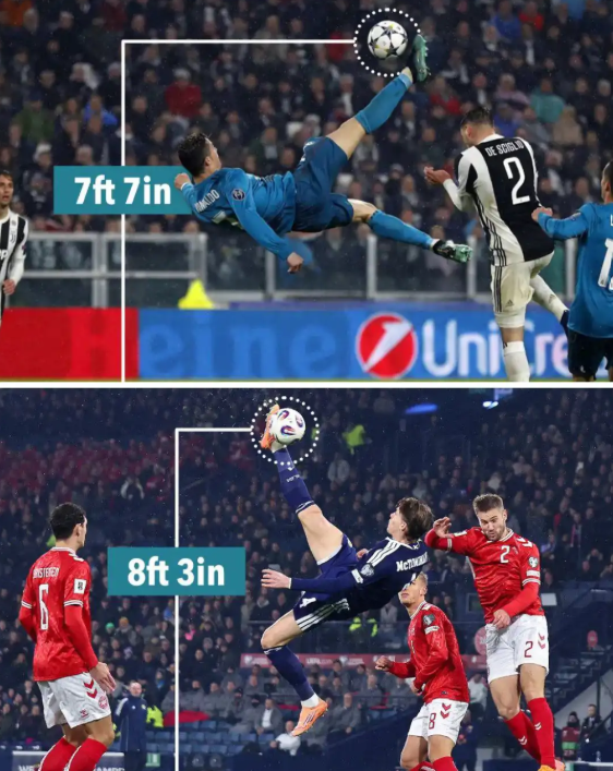 وبحسب تقارير صحفية اسكتلندية فإن ارتفاع قفزة مكتومناي نجم مانشستر يونايتد الإنجليزي السابق في الهواء وصل إلى 8 أقدام متفوقًا على رقم فريد لكريستيانو رونالدو بهدفه الشهير أمام يوفنتوس.