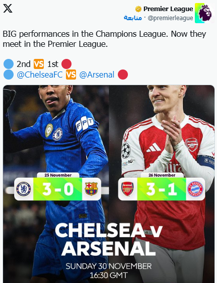 وأكدت رابطة الدوري الإنجليزي أن القمة المنتظرة تكتسب أهمية مضاعفة، بعدما قدم الفريقان عروضًا مميزة في دوري أبطال أوروبا خلال الجولة الخامسة، حيث عاد تشيلسي بانتصار عريض على برشلونة بثلاثية نظيفة، فيما واصل أرسنال تألقه القاري بفوز كبير على بايرن ميونخ بثلاثة أهداف مقابل هدف على ملعب الإمارات.