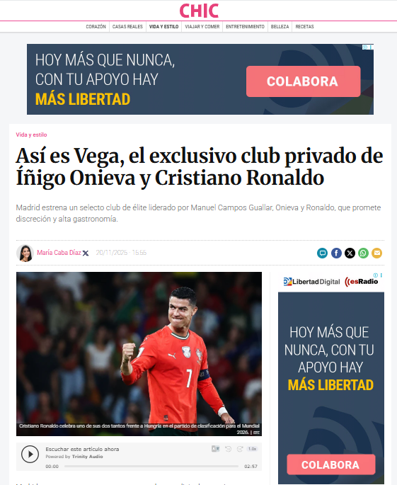 وقالت النشرة الإسبانية Libertad Digital، إن كريستيانو رونالدو البالغ من العمر 40 عامًا، بالتعاون مع رجل الأعمال إينيجو أونييفا وشركة Mabel Hospitality التابعة له ولرجل الأعمال مانويل كامبوس جوالار، أطلقوا نادي في مدريد، يسمى Vega Private Members Club.