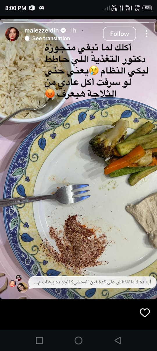 شاركت النجمة مي عز الدين جمهورها عبر خاصية "الاستوري" على إنستجرام تفاصيل طريفة حول التزامها بالنظام الغذائي الذي وضعه لها زوجها الدكتور أحمد تيمور. هذه المشاركة السريعة لاقت تفاعلًا واسعًا من المعجبين الذين أحبوا روح الدعابة التي نقلت بها معاناتها اللذيذة مع الالتزام الصحي.