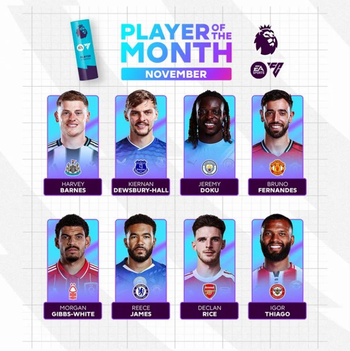 وانتهى شهر نوفمبر، والذي شهد تألق العديد من اللاعبين، بينما يشهد الدوري الإنجليزي الممتاز منافسة مشتعلة بين مانشستر سيتي وأرسنال وتشيلسي على اللقب هذا الموسم.
