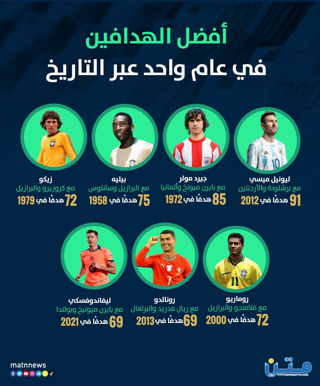 ميسي بالصدارة.. قائمة أفضل الهدافين في عام واحد عبر التاريخ (إنفوجراف)