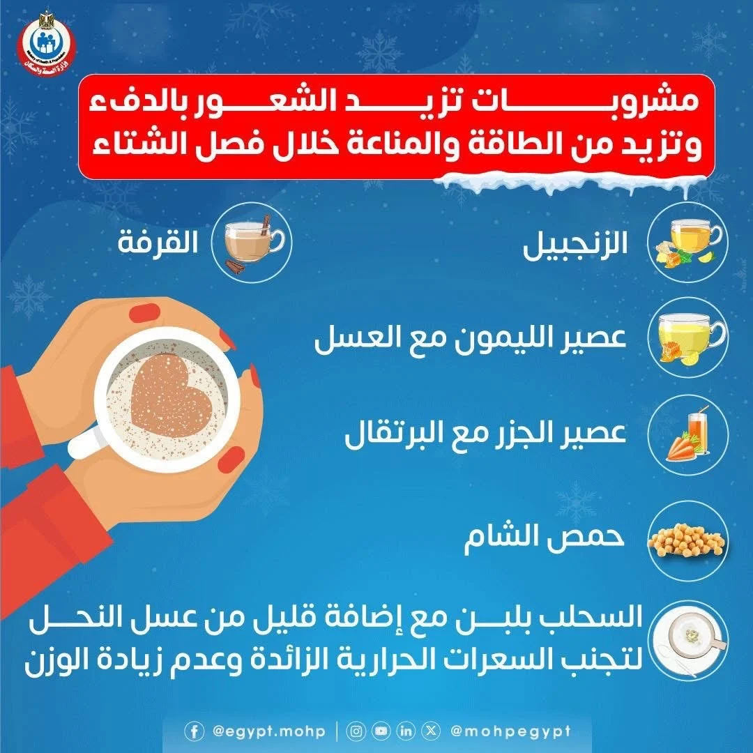 كشفت وزارة الصحة والسكان المصرية عن عدد من المشروبات التى تزيد من الشعور بالدفء وتزيد من الطاقة والمناعة خلال فصل الشتاء والتى تشمل:-