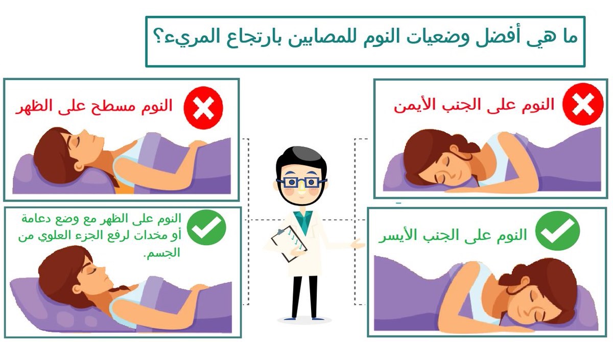 على الظهر: الاستلقاء على الظهر قد يزيد من تفاقم الارتجاع، ففي هذه الوضعية، قد يتجمع حمض المعدة في المريء.