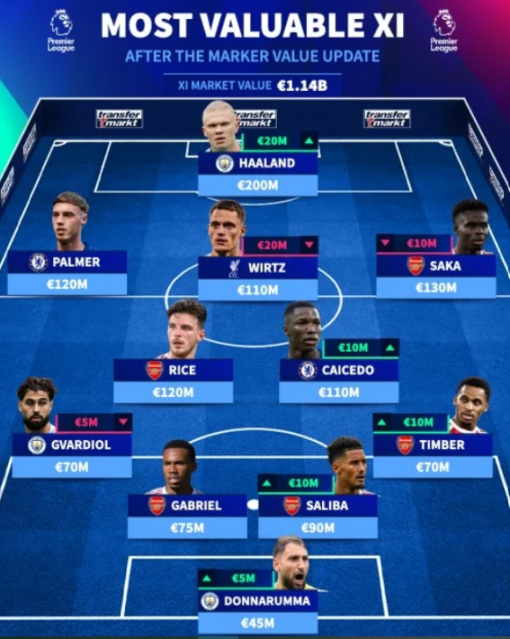 هذه القفزة، إلى جانب تحديثات واسعة في أندية مثل أرسنال وتشيلسي وليفربول، أسفرت عن تشكيل "أغلى تشكيلة أساسية" في البريميرليج هذا الموسم، بقيمة إجمالية بلغت 1.14 مليار يورو.