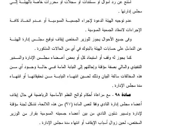 المادة رقم 98 المعدلة أيضًا في قانون الرياضة تمنح الحق للوزير في تعيين لجنة مؤقتة من أعضاء الجمعية العمومية أو من ذوي الخبرة بقرار وزاري حتى زوال السبب أو انتهاء مدة المجلس.