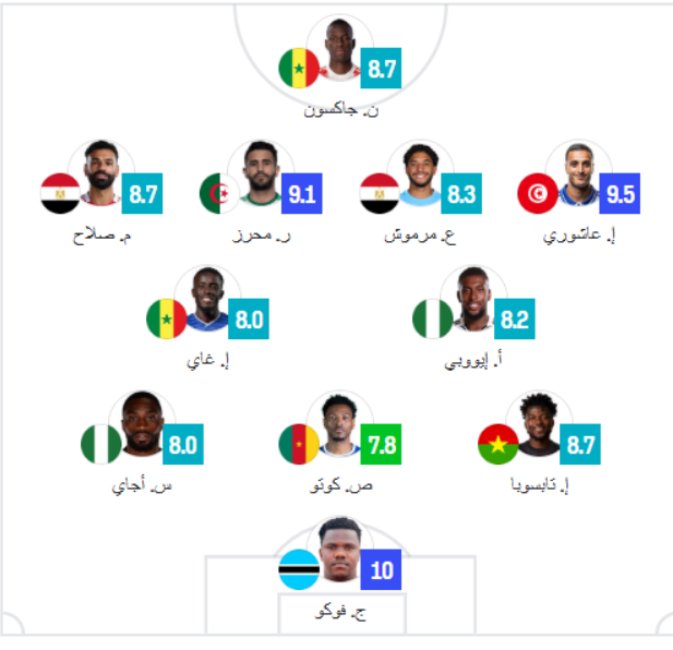 خط الوسط: إدريسا جاي “السنغال” - أليكس إيوبي “نيجيريا” - إلياس العاشوري “تونس” - محمد صلاح “مصر” - رياض محرز “الجزائر” - عمر مرموش "مصر".