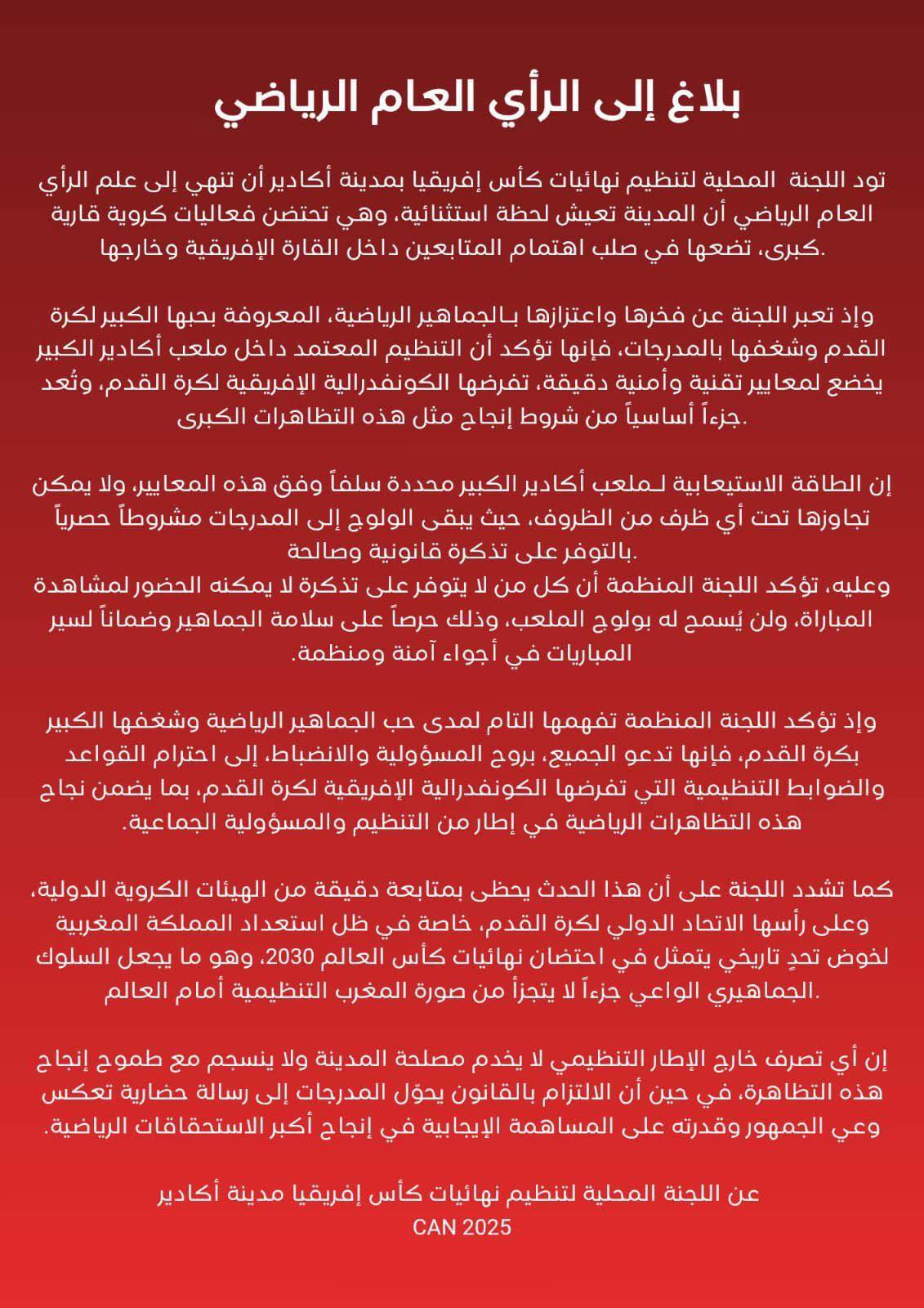 وفي بيان رسمي، ذكرت اللجنة المحلية المنظمة لبطولة كأس أمم إفريقيا 2025: "تود اللجنة المحلية لتنظيم نهائيات كأس إفريقيا بمدينة أغادير أن تنهي إلى علم الرأي العام الرياضي أن المدينة تعيش لحظة استثنائية، وهي تحتضن فعاليات كروية قارية كبرى، تضعها في صلب اهتمام المتابعين داخل القارة الإفريقية وخارجها".