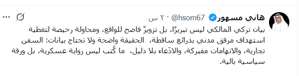 في تصعيد كلامي يعكس حجم الاحتقان الشعبي والسياسي في الجنوب، شن الكاتب الصحفي والمحلل السياسي البارز هاني مسهور هجومًا عنيفًا على الرواية الرسمية التي ساقها المتحدث باسم التحالف تركي المالكي بشأن استهداف ميناء المكلا.
