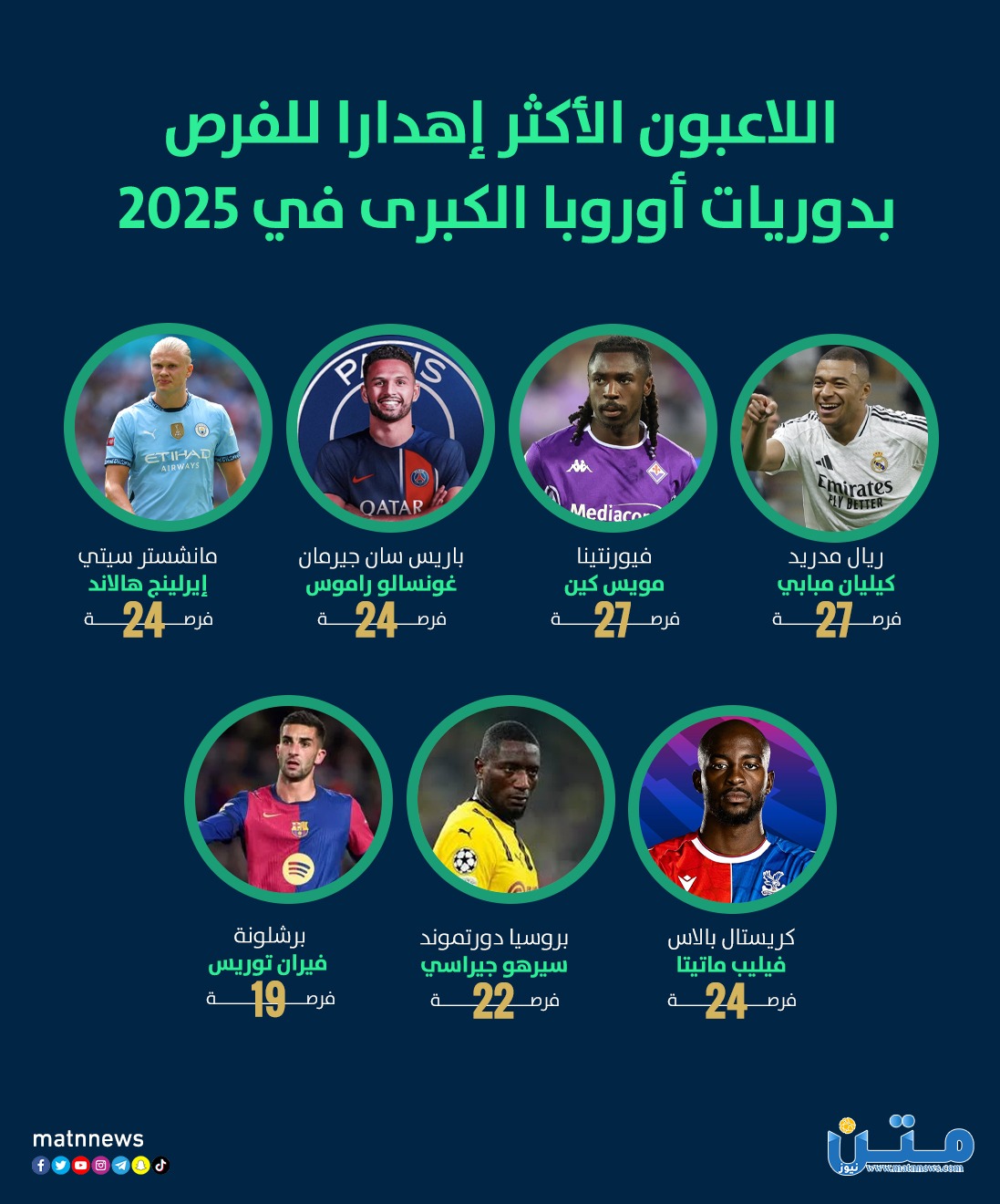 بصدارة مبابي.. اللاعبون الأكثر إهدارا للفرص بدوريات أوروبا الكبرى في 2025 (إنفوجراف)