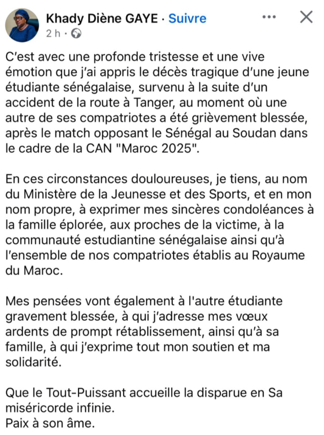 وقالت وزيرة الرياضة عبر حسابها: "ببالغ الحزن والتأثر الشديد، تلقيت نبأ الوفاة المأساوية لطالبة سنغالية شابة، إثر حادث سير وقع في مدينة طنجة، في الوقت الذي أُصيبت فيه إحدى مواطناتها بجروح خطيرة، وذلك عقب المباراة التي جمعت بين منتخبي السنغال والسودان ضمن منافسات كأس الأمم الأفريقية بالمغرب."