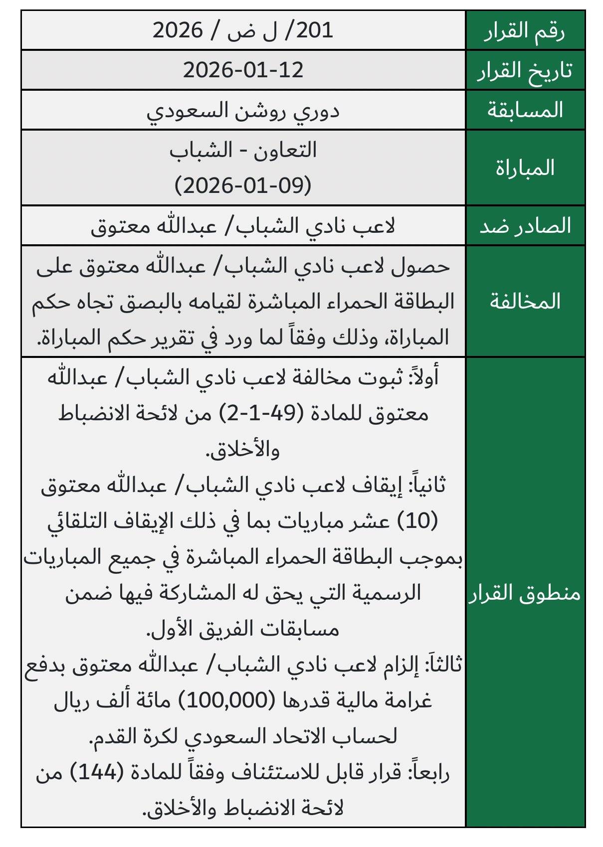 ضربة قوية للشباب.. إيقاف عبد الله معتوق 10 مباريات عقب تصرفه غير الأخلاقي