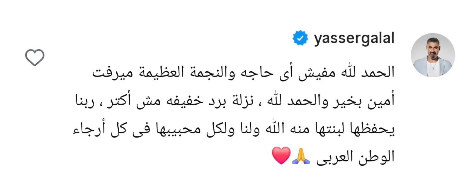 نفى النجم ياسر جلال كافة الأنباء المتداولة حول نقل الفنانة القديرة ميرفت أمين إلى أحد المستشفيات الخاصة بعد تعرضها لأزمة صحية مفاجئة، وأوضح جلال من خلال تعليق رسمي عبر حسابه الشخصي على أحد المنشورات المتداولة أن النجمة الكبيرة تتمتع بصحة جيدة، وأن كل ما تعرضت له هو "نزلة برد خفيفة" لا تستدعي القلق أو التهويل الإعلامي، حيث كتب قائلًا: "الحمد لله مفيش أى حاجة والنجمة العظيمة ميرفت أمين بخير والحمدلله، ربنا يحفظها لبنتها منه الله ولنا ولكل محبيها فى كل أرجاء الوطن العربى"، وتأتي هذه التصريحات لتقطع الطريق أمام الشائعات التي انتشرت بسرعة الصباح اليوم السبت 25 أبريل 2026، والتي أثارت قلقًا كبيرًا بين محبي "جميلة الشاشة" في مختلف أنحاء العالم العربي، خاصة بعد النجاح الكبير الذي حققته في موسم دراما رمضان المنقضي.