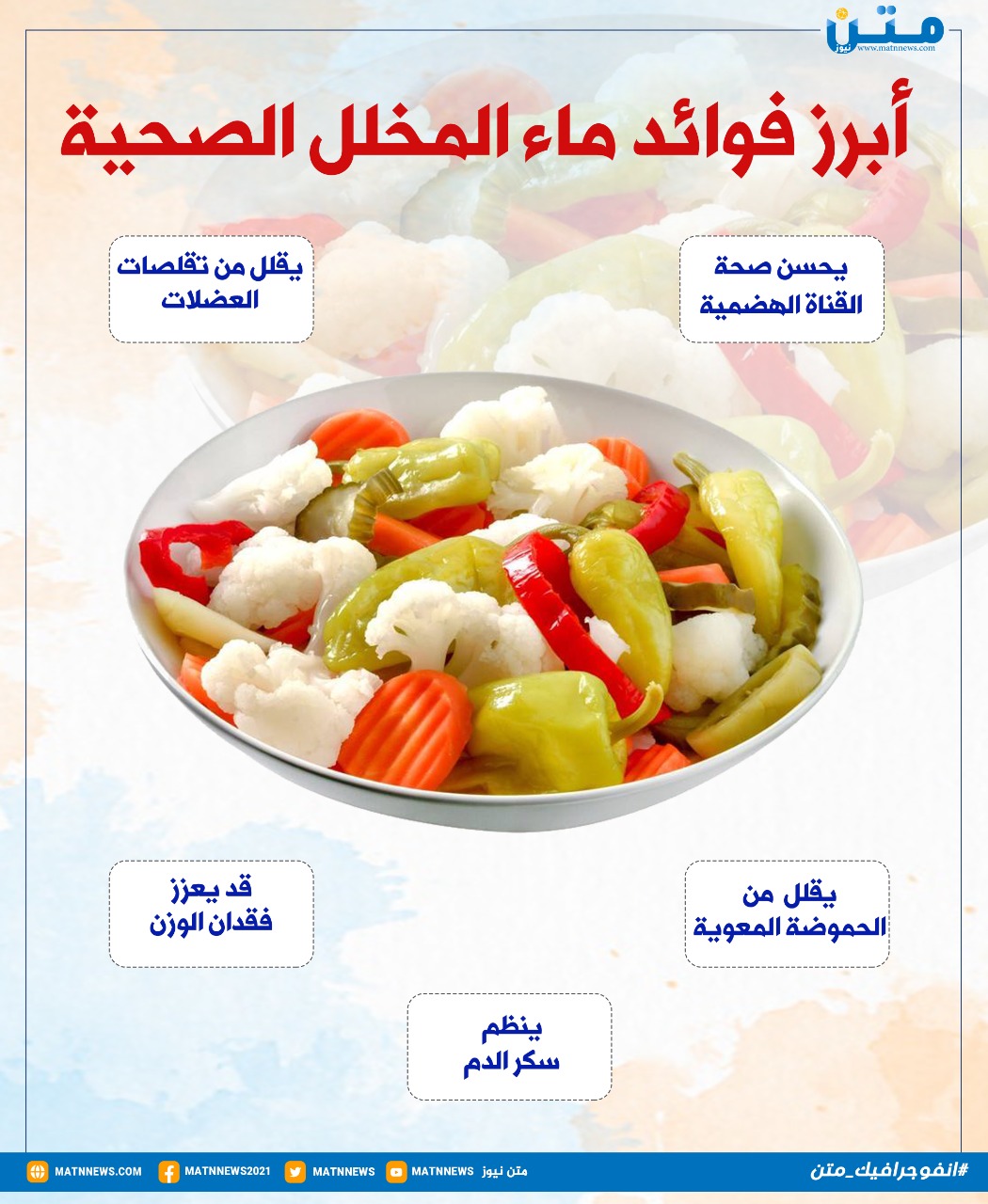 أبرز فوائد ماء المخلل الصحية الثلاثاء 08/فبراير/2022 - 09:03 م 2/8/2022 9:03:12 PM انفوجراف متن محمد حسن شارك طباعة شارك المخلل فوائد المخلل ماء المخلل فوائد صحية الهضم