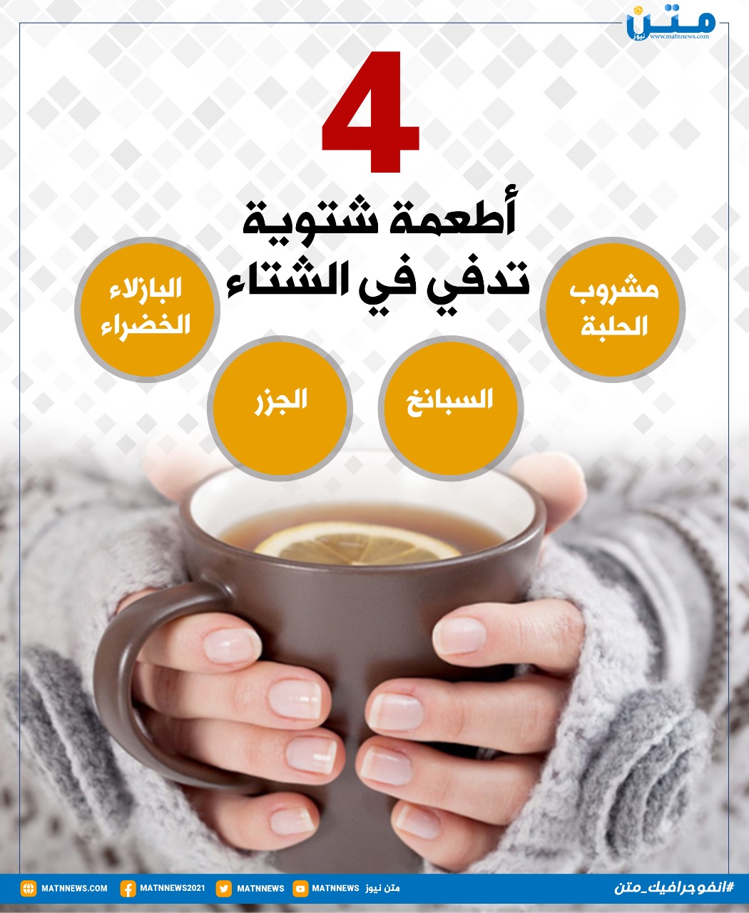 4 أطعمة شتوية تدفي في الشتاء الثلاثاء 08/فبراير/2022 - 09:04 م 2/8/2022 9:04:24 PM انفوجراف متن محمد حسن شارك طباعة شارك أطعمة صحية أطعمة شتوية الدفء الشتاء