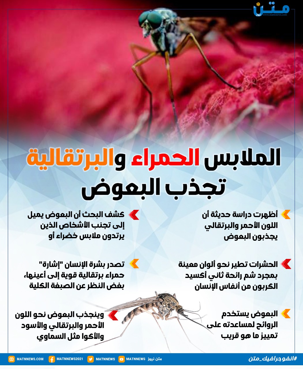 الملابس الحمراء والبرتقالية تجذب البعوض الخميس 10/فبراير/2022 - 10:23 م 2/10/2022 10:23:33 PM انفوجراف متن محمد حسن شارك طباعة شارك البعوض الملابس الحمراء الملابس البرتقالية