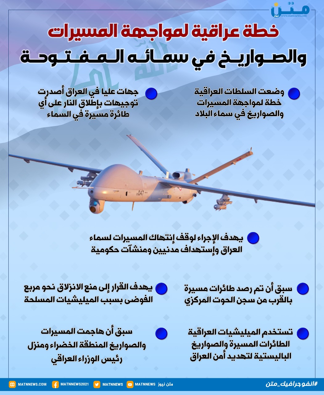 خطة عراقية لمواجهة المسيرات والصورايخ الباليستية الخميس 17/فبراير/2022 - 07:52 م 2/17/2022 7:52:51 PM انفوجراف متن محمد حسن شارك طباعة شارك العراق خطة عراقية مواجهة المسيرات الصواريخ الباليستية