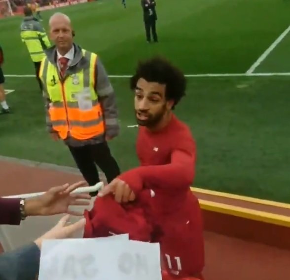 لبى النجم المصرى محمد صلاح مهاجم ليفربول الإنجليزي، طلب أحد مشجعى إنتر ميلان، الذى رفع لافته يطلب فيها الحصول على قميصه، ليذهب نجم الريدز عقب نهاية اللقاء الذى جمعهما مساء أمس الأربعاء، وأهدى قميصه له.