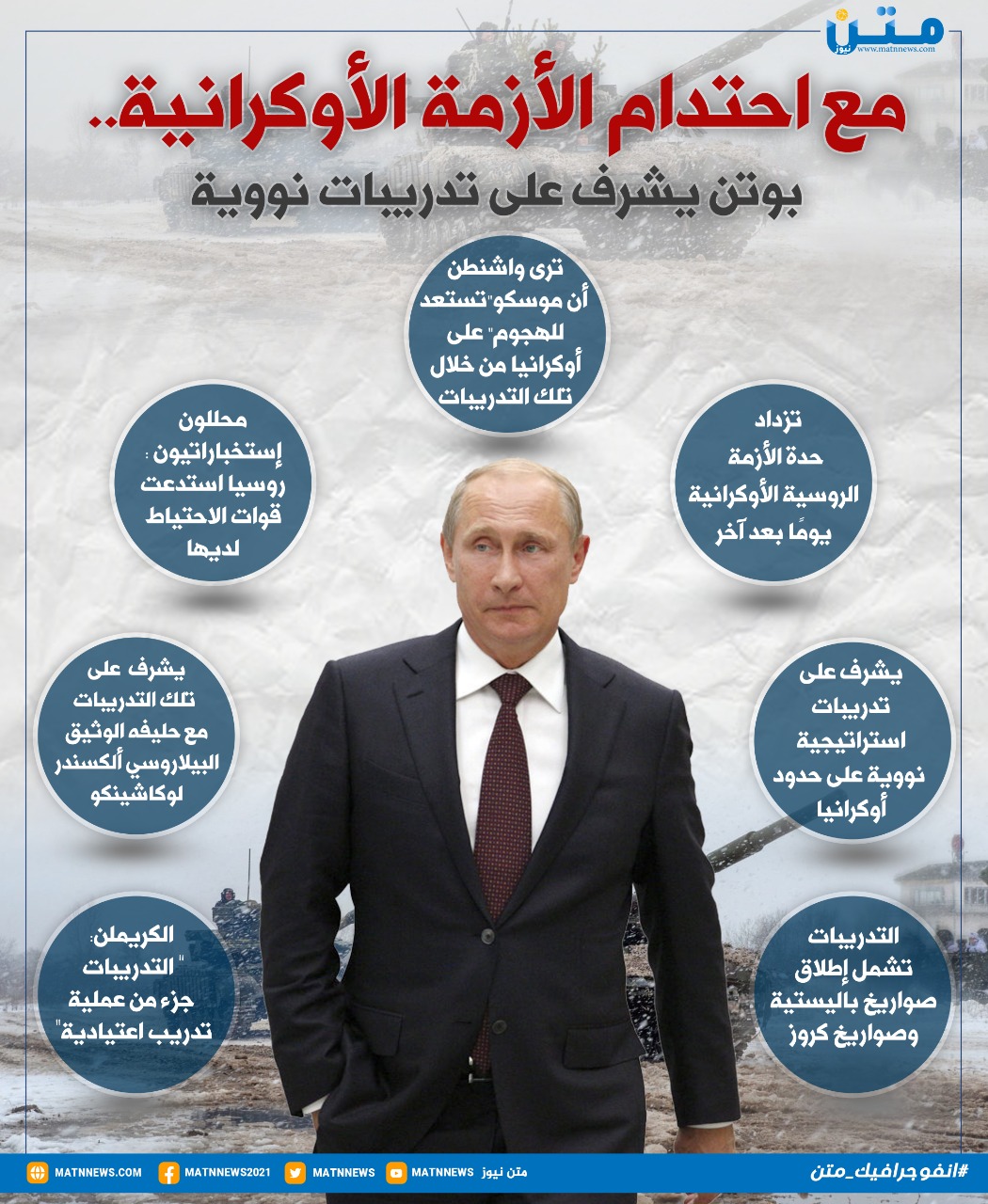 بوتن يشرف على تدريبات نووية السبت 19/فبراير/2022 - 09:44 م 2/19/2022 9:44:49 PM انفوجراف متن محمد حسن شارك طباعة شارك روسيا الأزمة الأوكرانية بوتن تدريبات نووية قصف