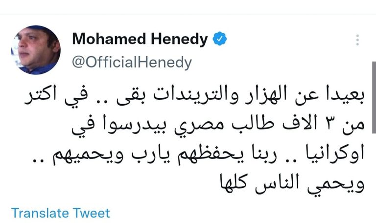 وبعد وقت قصير من كتابة هذا التعلق غرد هنيدي حول الأزمة بين روسيا وأوكرانيا مرة ثانية، وكتب قائلا: "بعيدا عن الهزار والترندات بقى، في أكثر من 3 آلاف مصري بيدرسوا في أوكرانيا.. ربنا يحفظهم ويحميهم.. ربنا يحمي الناس كلها".