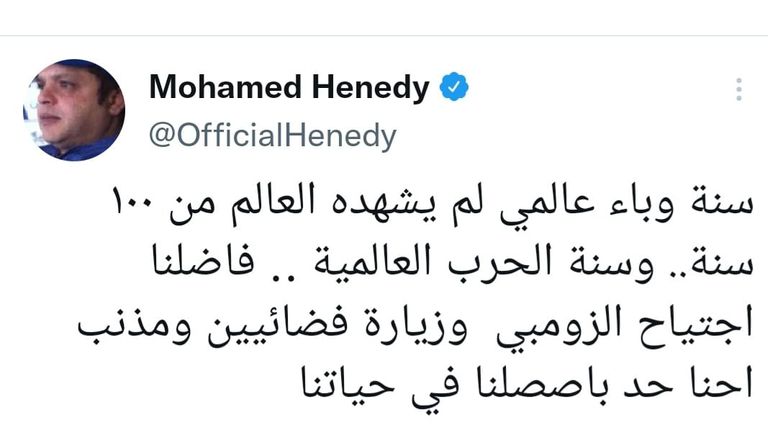 وعلق هنيدي على العملية العسكرية التي بدأتها روسيا، فجر الخميس، ضد أوكرانيا عبر حسابه الشخصي على موقع تويتر قائلا: "سنة وباء عالمي لم يشهده العالم من 100 سنة.. وسنة الحرب العالمية.. فاضلنا اجتياح الزومبي وزيارة فضائيين ومذنب.. إحنا حد باصصلنا في حياتنا".
