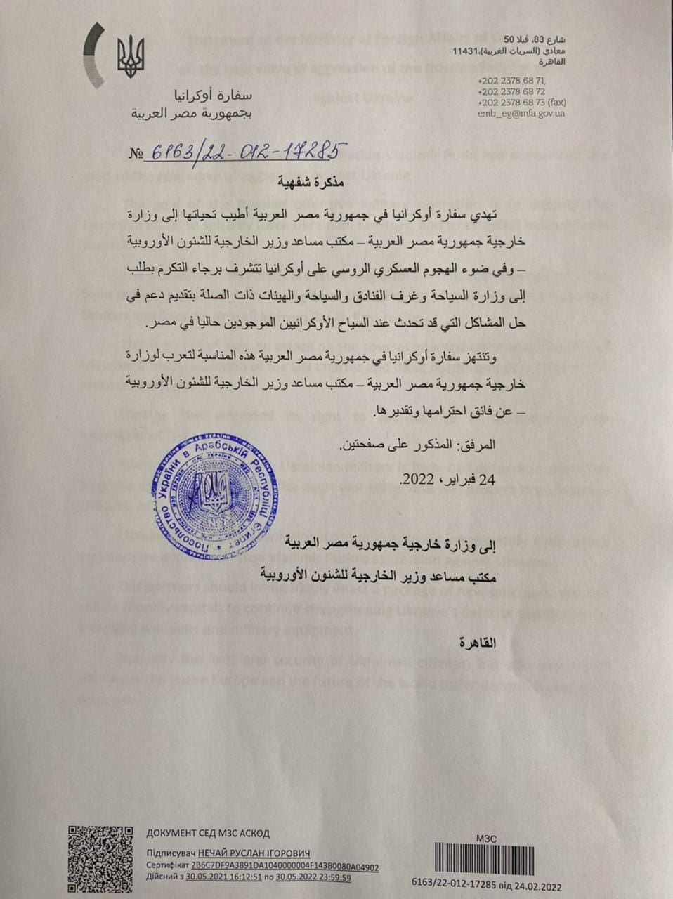 وإزاء ذلك، طالبت السفارة الأوكرانية في القاهرة وزارة الخارجية المصرية بتقديم الدعم الكامل للرعايا الأوكرانيين، مع مخاطبة وزارة السياحة وغرف الفنادق السياحية والهيئات ذات الصلة بتقديم الدعم وحل المشاكل التي قد تحدث للسياح الأوكرانيين الموجودين حاليًا في مصر.