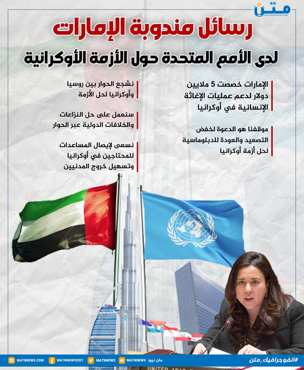 رسائل مندبة الإمارات في الأمم المتحدة حول الأزمة الأوكرانية مندوبة الإمارات في الأمم المتحدة الأربعاء 02/مارس/2022 - 08:30 م 3/2/2022 8:30:42 PM انفوجراف متن محمد حسن شارك طباعة شارك الامارات مندوبة الإمارات في الأمم المتحدة الحرب الروسية الأوكرانية الأزمة الأوكرانية مندوبة الإمارات