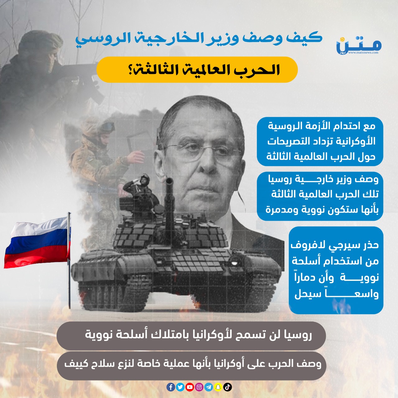- وصف وزير خارجية روسيا تلك الحرب العالمية الثالثة بأنها ستكون نووية ومدمرة
