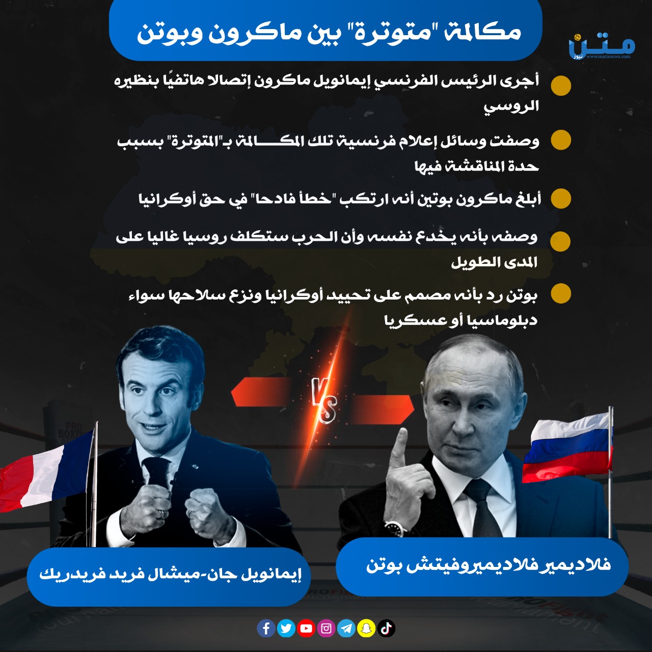 مكالمة متوترة بين ماكرون وبوتين بوتين وماكرون الخميس 03/مارس/2022 - 10:07 م 3/3/2022 10:07:05 PM انفوجراف متن محمد حسن شارك طباعة شارك ماكرون بوتين مكالمة متوترة الحرب الروسية الأوكرانية أوكرانيا