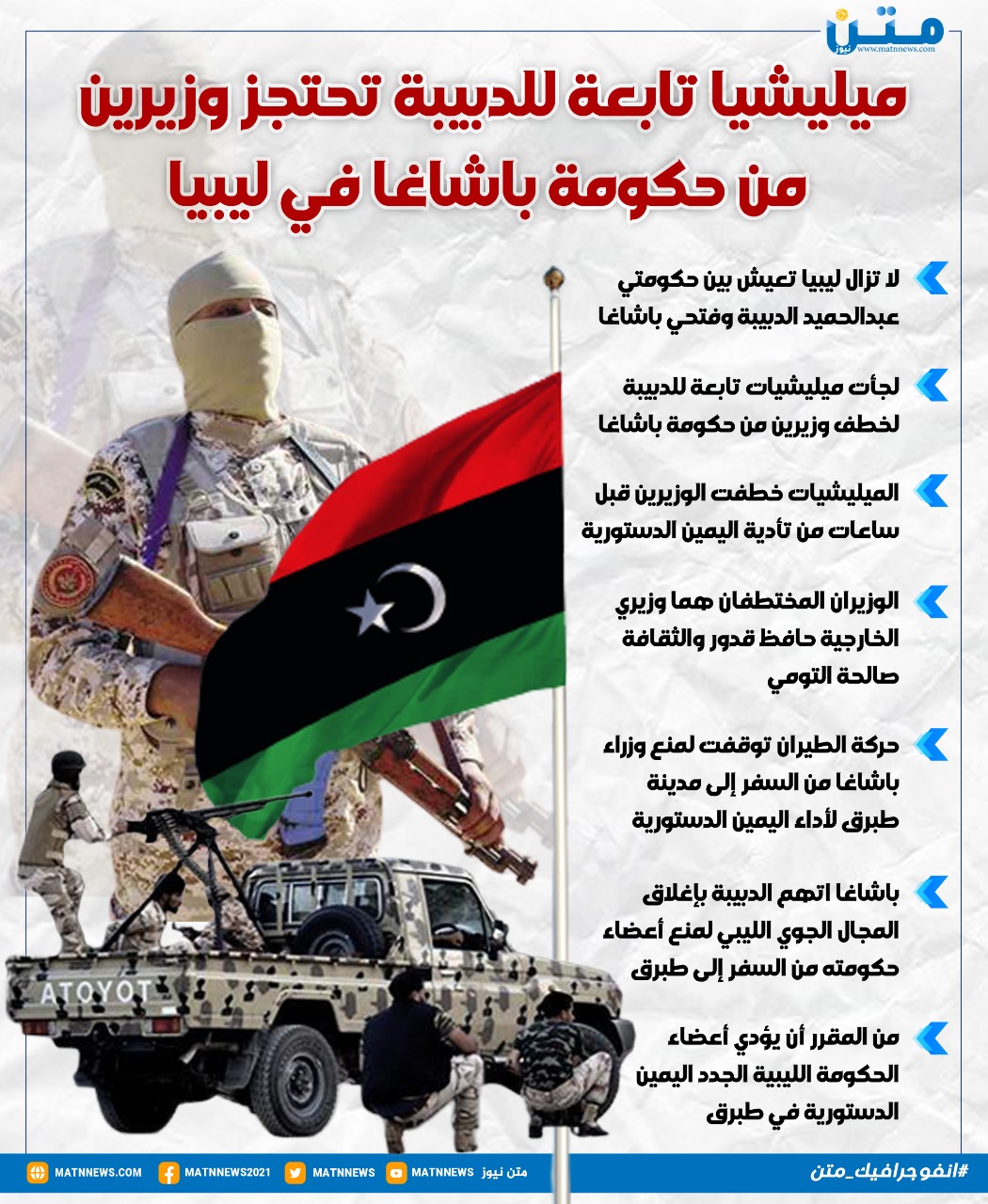 ميليشيات تابعة للدبيبة تحتجز وزيرين من حكومة باشاغا في ليبيا الخميس 03/مارس/2022 - 10:36 م 3/3/2022 10:36:12 PM انفوجراف متن محمد حسن شارك طباعة شارك ليبيا حكومة باشأغا حكومة الدبيبية تحتجز وزيرين طرابلس