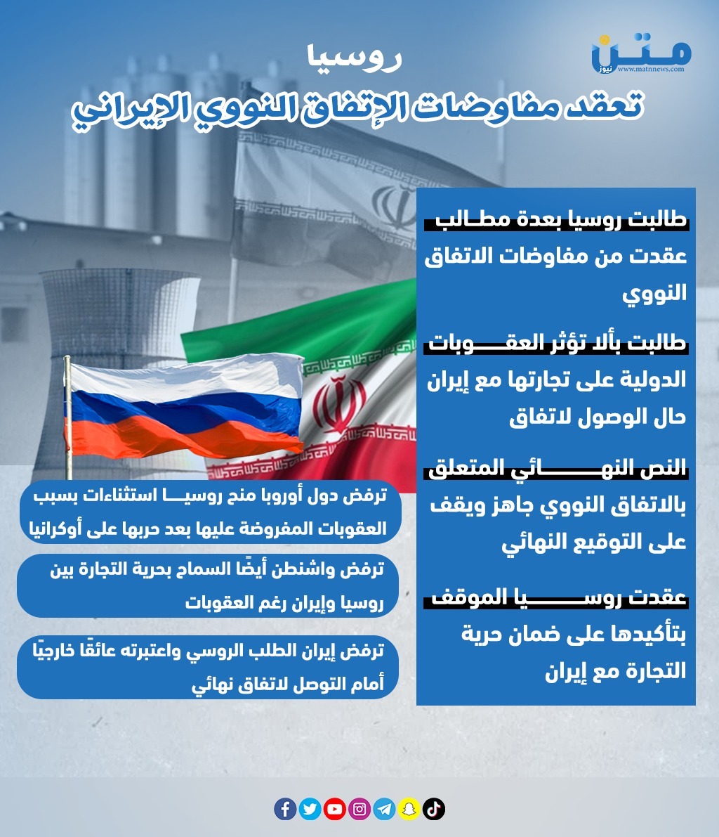 روسيا تعقد مفاوضات الإتفاق النووي مع إيران الإثنين 14/مارس/2022 - 08:49 م 3/14/2022 8:49:07 PM انفوجراف متن محمد حسن شارك طباعة شارك روسيا الاتفاق النووي الإيراني تعقيد مسار مفاوضات مباحثات في