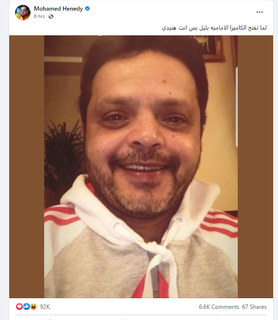 دخل النجم المصري محمد هنيدى، في وصلة "هزار" مع النجم محمد سعد، بعدما نشر الأول صورته عبر حسابه الشخصى على موقع "فيس بوك"، ممازحًا الجمهور بتعليقه على الصورة التى شاركها معهم بعد منتصف الليل، "لما تفتح الكاميرا الأمامية بليل بس أنت هنيدى"، في إشارة إلى طلته الجميلة طوال الوقت.