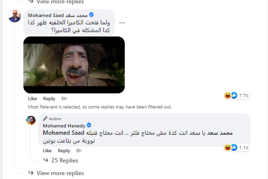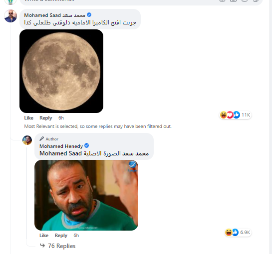 من جانبه، رد الفنان محمد سعد، في التعليق على صورة هنيدى، بصورة للقمر، يصاحبها بتعليقه، "جربت افتح الكاميرا الأمامية دلوقت طلعلى كدا"، وذلك فى تشبيه لنفسه بالقمر في جماله، وذلك على سبيل الدعابة، ليرد محمد هنيدى، بنشر صورة أخرى للفنان محمد سعد، من أحد أعماله، ويظهر فيها بمظهر غريب، وعلق هنيدى على صورة محمد سعد، "الصورة الأصلية"، وجاء رد سعد، سريعًا، لينشر صورة لنفسه أكثر غرابة، وعلق عليها، "ولما فتحت الكاميرا الخلفية ظهر كدا.. متسائلًا: كدا المشكلة فى الكاميرا؟"، فمازحه هنيدى، بتعليقه مجددًا، "يا سعد أنت كدا مش محتاج فلتر، أنت محتاج قنبلة نووية من بتاعت بوتين".